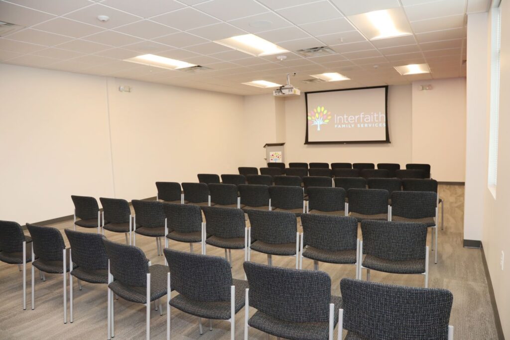 This is a perfect meeting space for conferences, staff meetings, and brainstorming sessions. The room is equipped with a projector and screen, a snack cart, a podium, free Wi-Fi, laptop projection capabilities, and a whiteboard upon request.